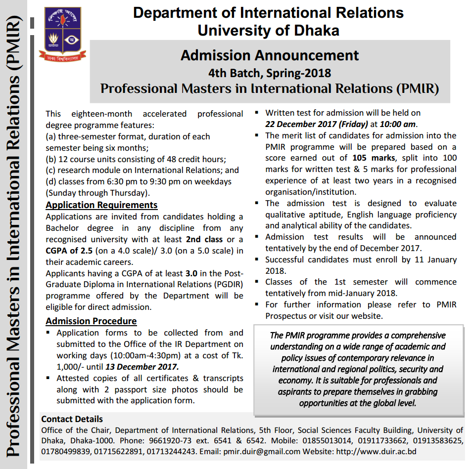 Admission Announcement : 4th Batch, Spring-2018, Professional Masters in International Relations (PMIR).