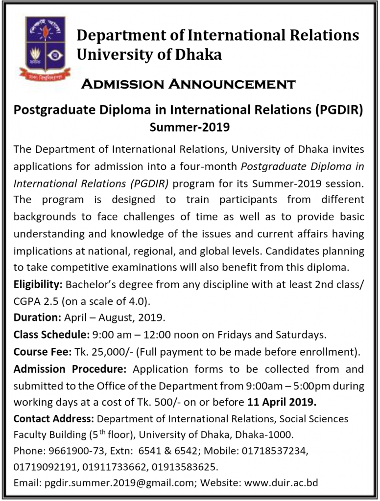 Postgraduate Diploma in International Relations (PGDIR) Summer- 2019 25 Mar,2019 Postgraduate Diploma in International Relations (PGDIR) Summer- 2019. Here is the notice-